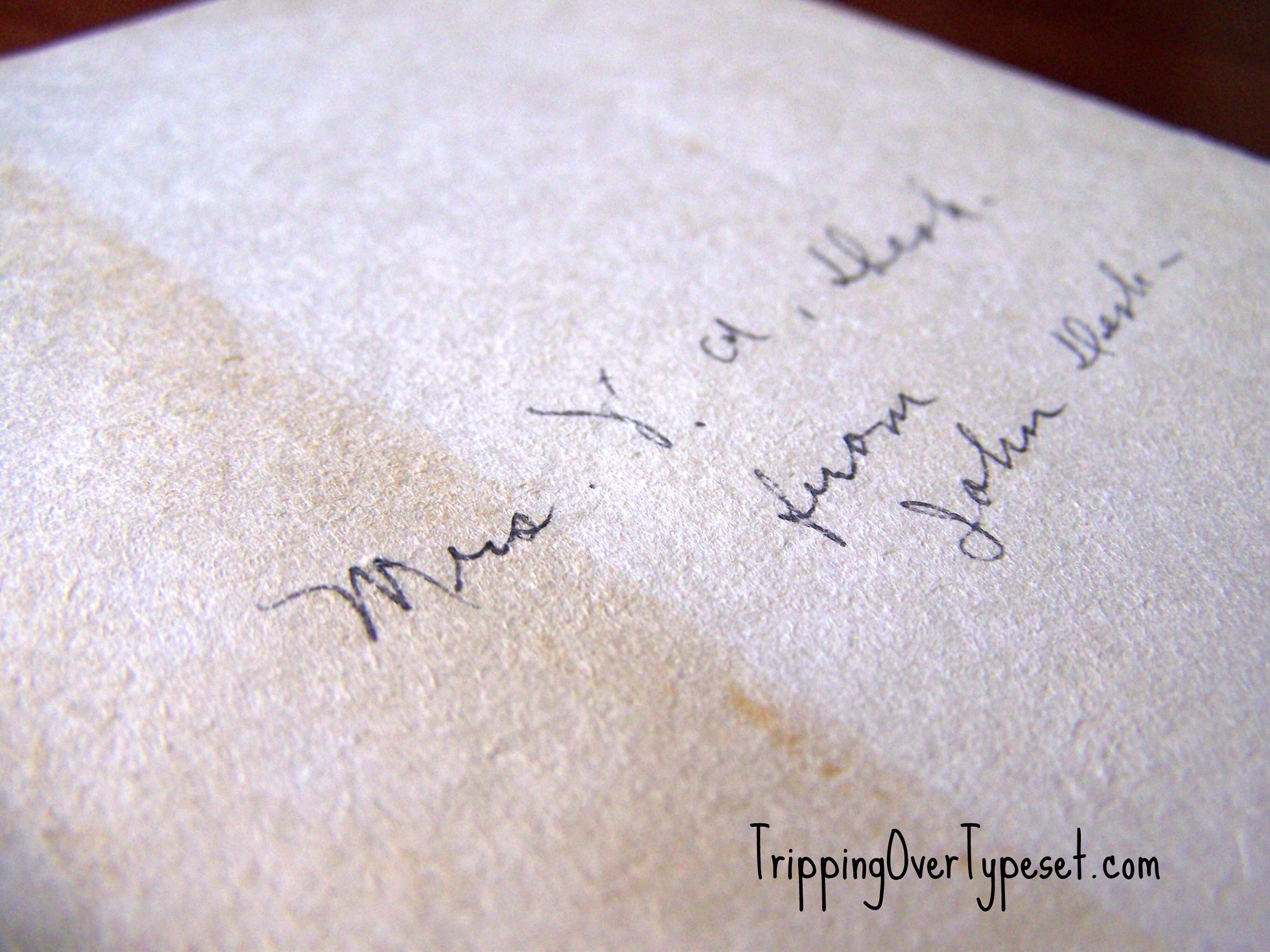 My mother’s mother died before I was born. My mother gave me part of her name and mom always said I was like her. So while going through a stack of books, my eye caught a glimpse of a blue bounded book hidden among dingy browns and dark hues. I opened the cover to discover the inscription, “Mrs. V.A. Desh from John Desh— Christmas, 1937”