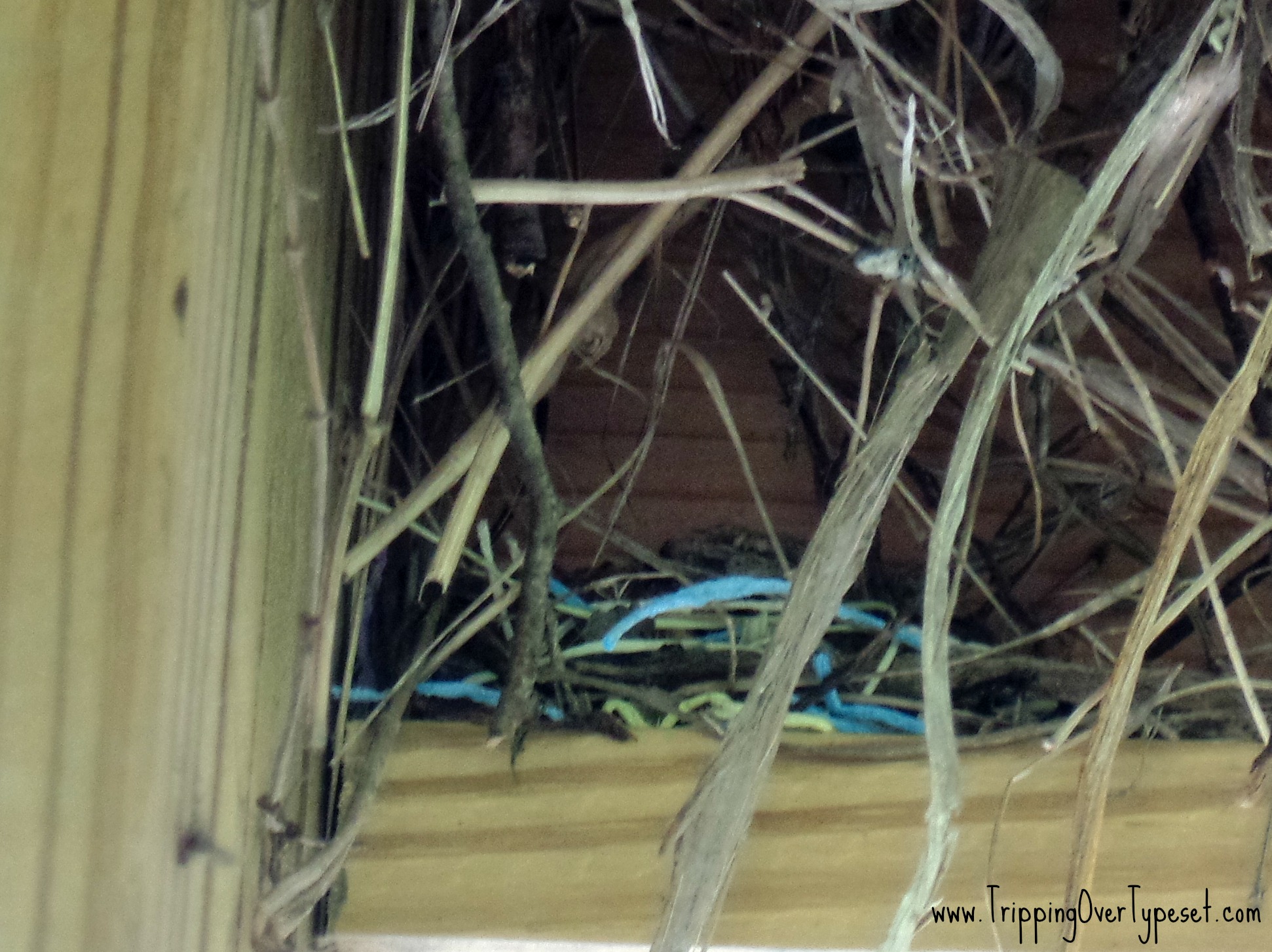 While Dave and Matt were mowing, they spotted some of that bright blue string in a robins nest. I think that bird must be smiling pretty with that electric blue woven in and through the hay stubble and broken sticks.