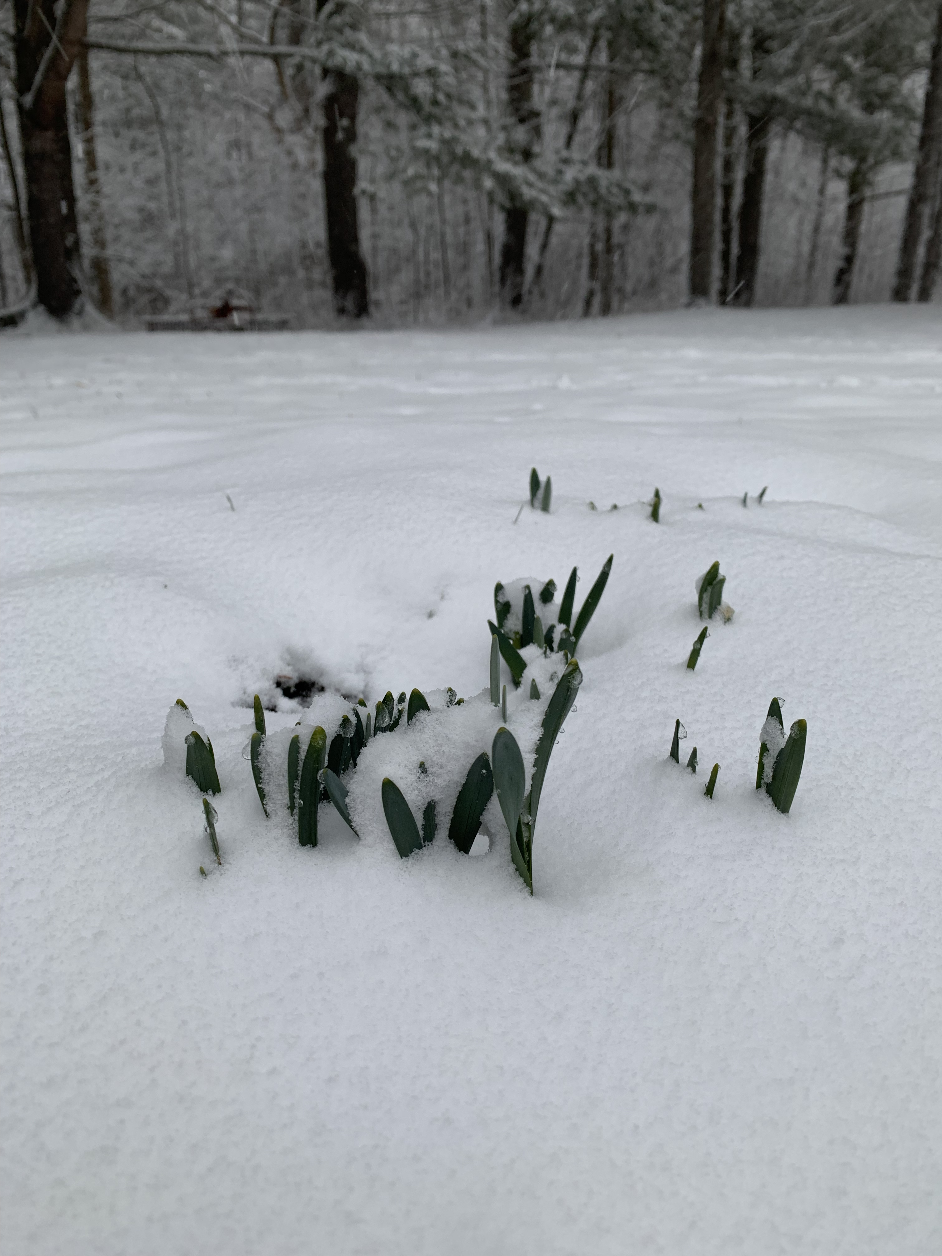 Last week I watched as my daffodils began popping up from their dark cozy nesting places. I whispered to them, “Go back! The snow isn’t finished… it will ravage us again!”